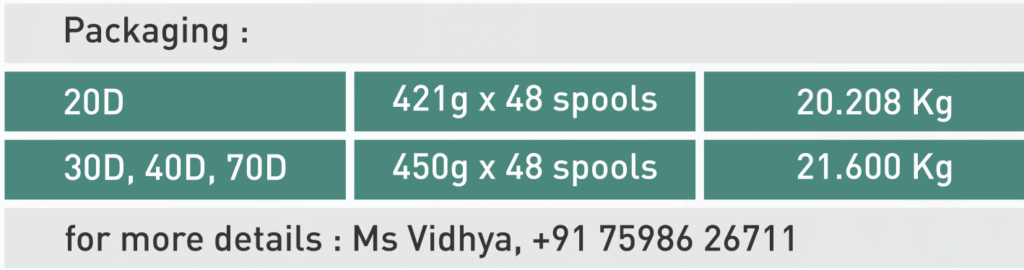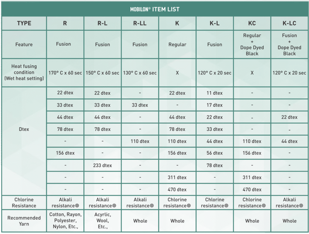 MOBILON™ is an eco-friendly spandex produced through unique melt spinning, eliminating the need for organic solvents and significantly reducing CO2 emissions. It offers sustainable options, including recycled materials and plant-based biomass types. Known for its soft fit and dimensional stability, MOBILON™ is widely used in leggings, innerwear, sportswear, and fitness apparel. By collecting and reusing production waste, MOBILON™ minimizes environmental impact and aims for future product recycling.